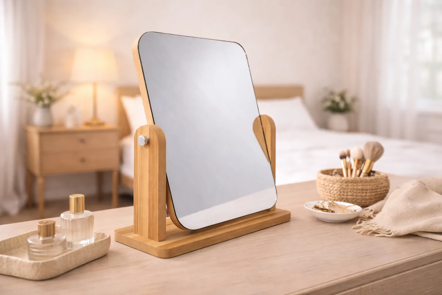 Espejo de mesa con diseño moderno y elegante, ideal para el dormitorio, tocador o baño. Cuenta con una base de madera de acabado natural que aporta calidez y estilo, y un espejo rectangular de alta claridad, perfecto para el uso diario en maquillaje, cuidado personal o afeitado.