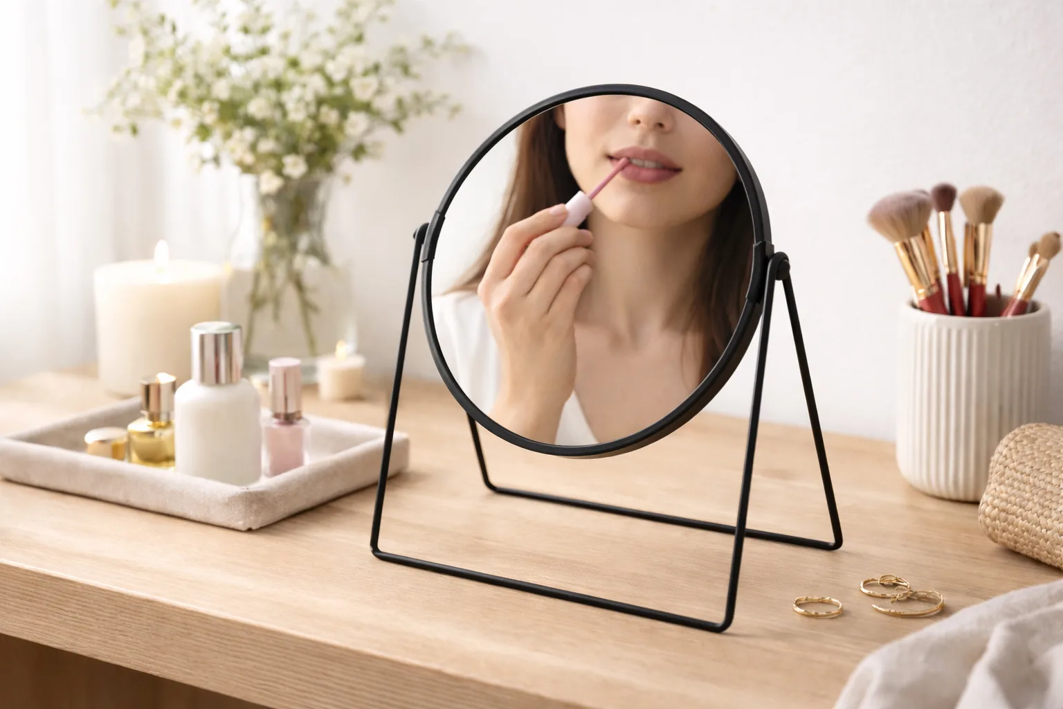 Su estructura metálica en acabado negro mate sostiene un espejo circular de líneas limpias, creando una estética ligera y elegante. El soporte permite una colocación estable y cómoda, ideal para el uso diario sin perder armonía visual.