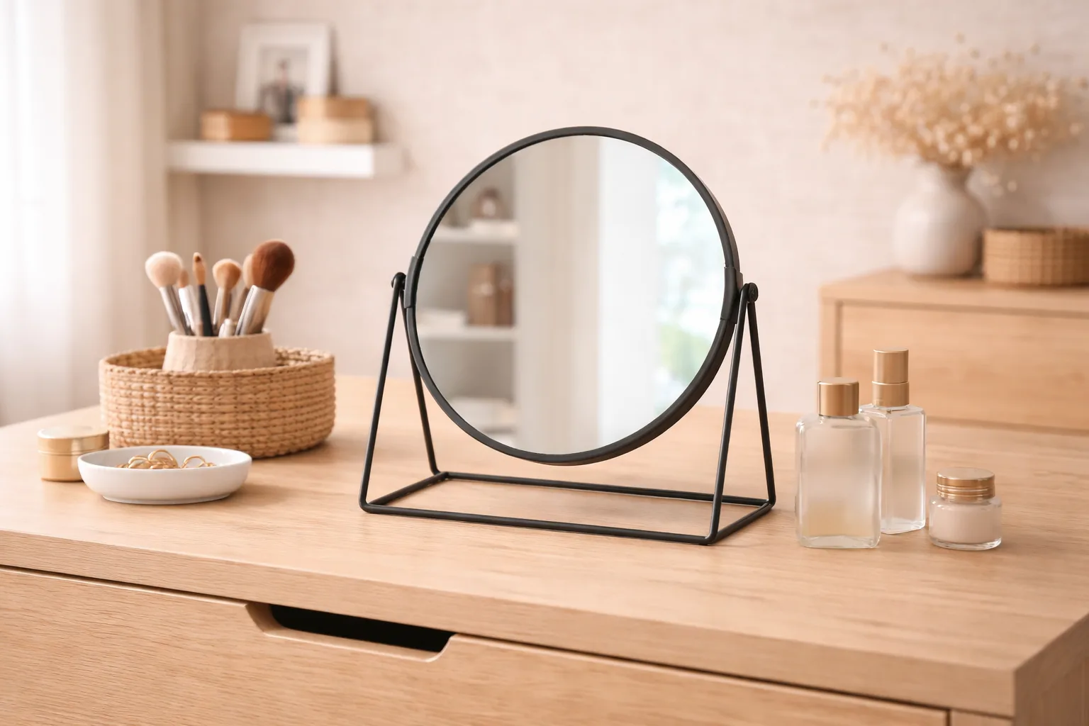 Un objeto funcional convertido en pieza decorativa. Este espejo de mesa de diseño minimalista y contemporáneo aporta equilibrio y sofisticación a cualquier espacio, desde dormitorios y tocadores hasta baños modernos.
