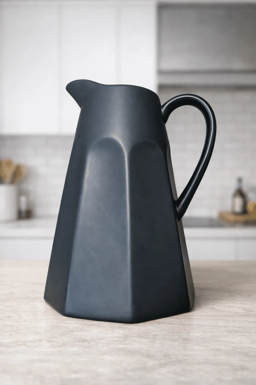Aporta elegancia y funcionalidad a tu cocina con esta jarra de diseño minimalista. Su forma geométrica y acabado mate la convierten en una pieza ideal tanto para servir bebidas como para complementar la decoración de espacios modernos.