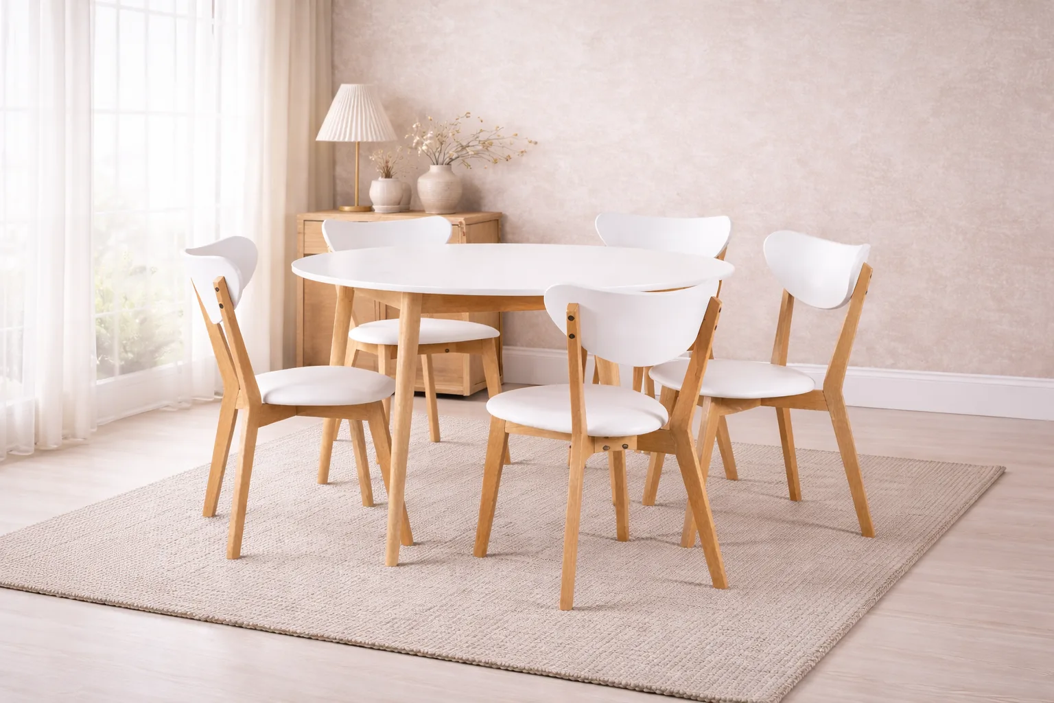 Gracias a su diseño minimalista escandinavo, este comedor se adapta fácilmente a espacios pequeños y modernos, aportando luminosidad y elegancia. Las sillas cuentan con asientos ergonómicos y cómodos, pensados para el uso diario y reuniones familiares.