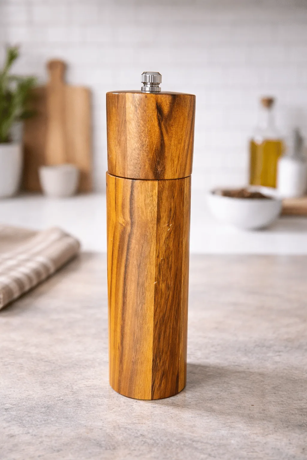 Molino manual para pimienta o sal elaborado en madera natural, con un diseño elegante y minimalista que combina funcionalidad y estilo. Ideal para realzar el sabor de tus comidas con especias recién molidas, aportando un toque sofisticado a tu cocina o mesa.