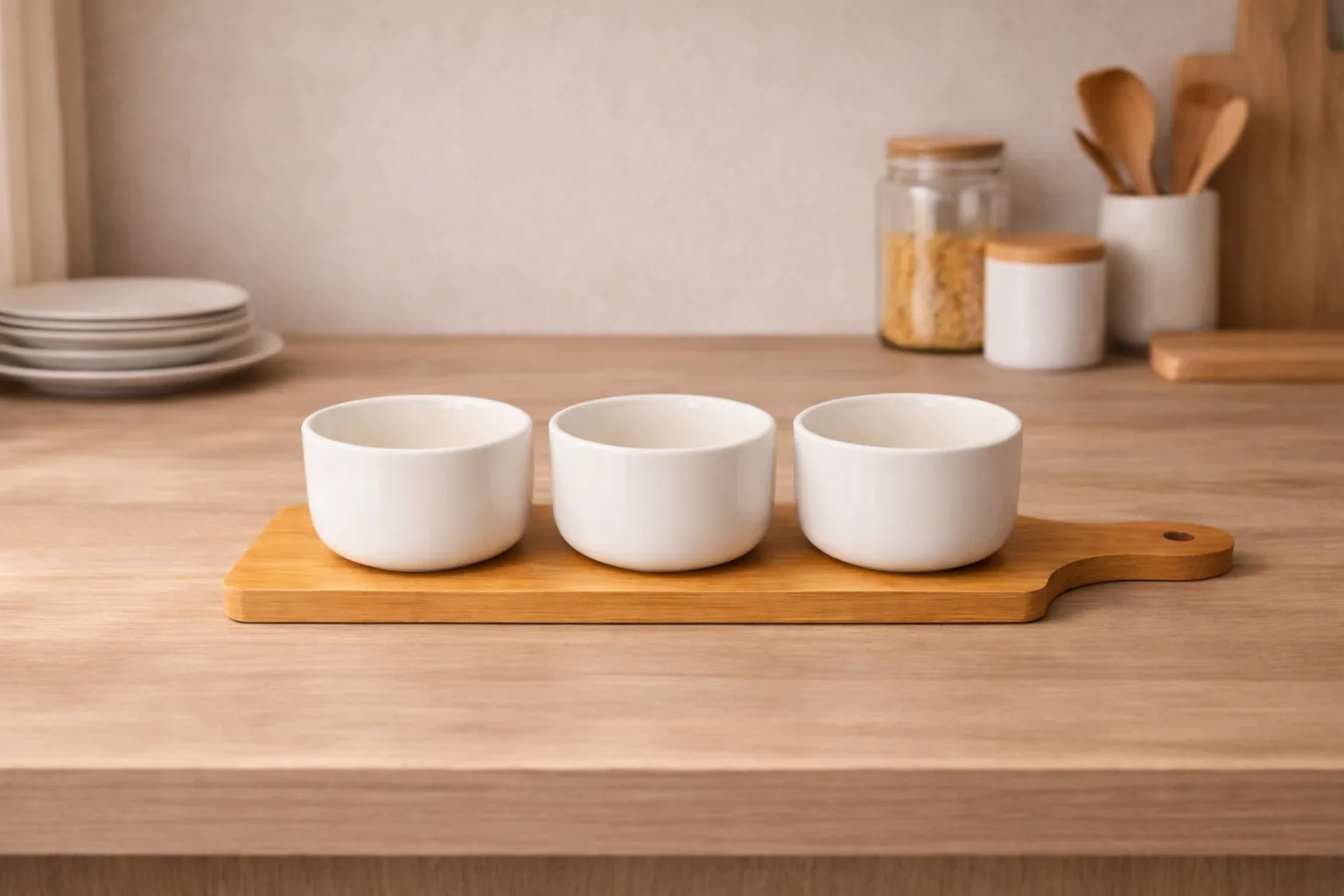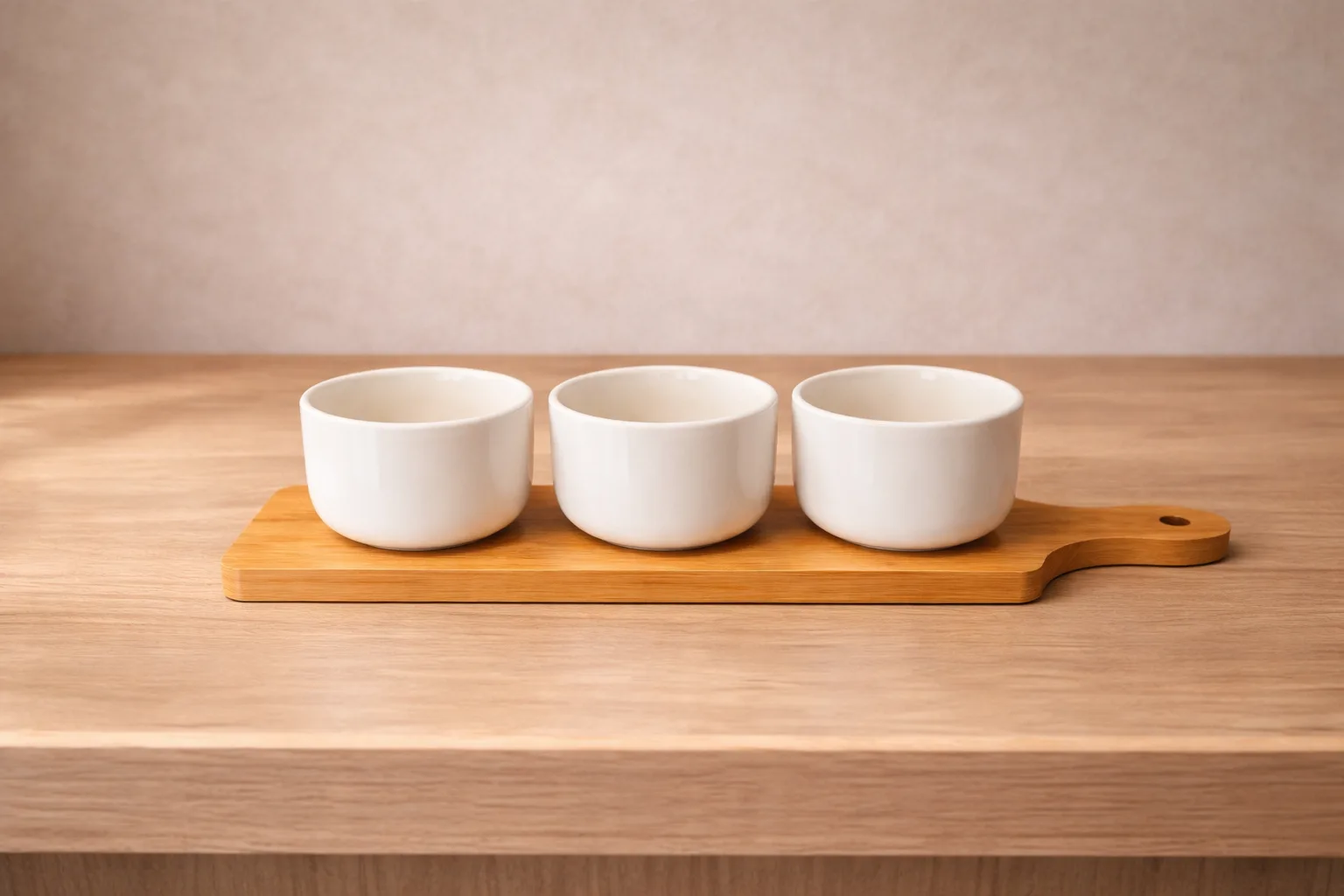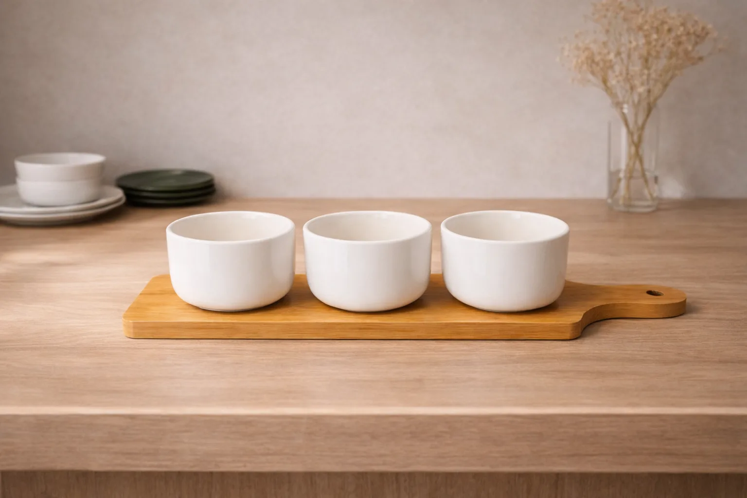 Presenta tus acompañamientos con elegancia y estilo. Este set de 3 bowls de cerámica blanca con base de bambú natural es ideal para servir salsas, dips, cremas, frutos secos o aperitivos, aportando un toque moderno y minimalista a tu mesa.